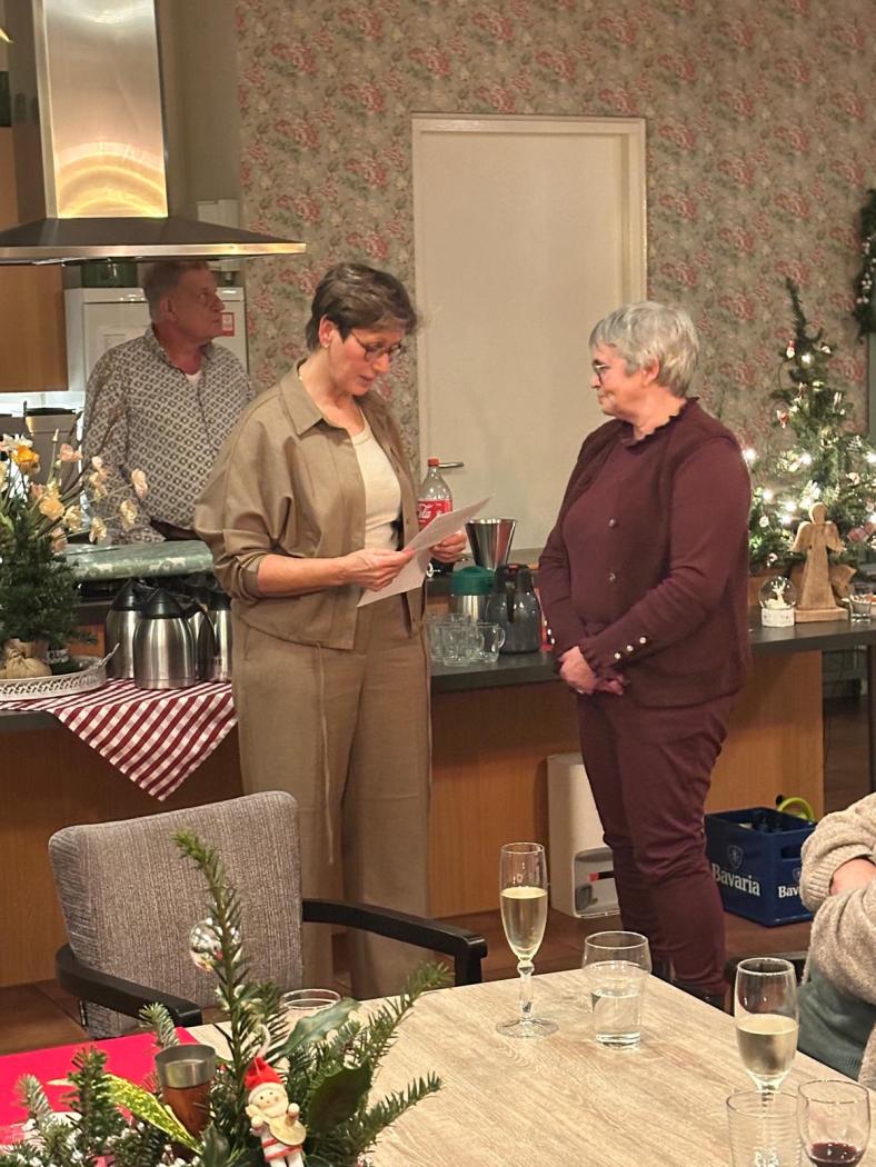 Tijdens de kerstbijeenkomst van alle vrijwilligers en medewerkers zijn deze 2 trouwe vrijwilligers verrast met een mooi woordje van Mirjam, een bos bloemen en passend presentje.